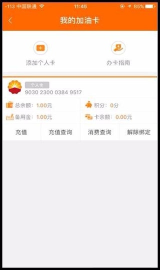 1、用户可以将加油卡绑定到APP,通过“我的加油卡”栏目查看卡内余额、积分和备用金等信息。