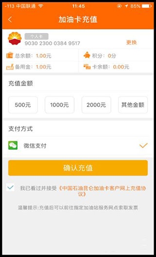 2、用户还可以通过APP随时为加油卡充值,并且支持微信支付。