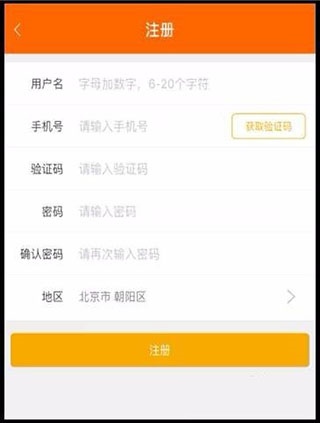 2、填写注册信息,包括用户名、手机号、验证码、密码,并选择所在地区,点击【注册】按钮完成注册。