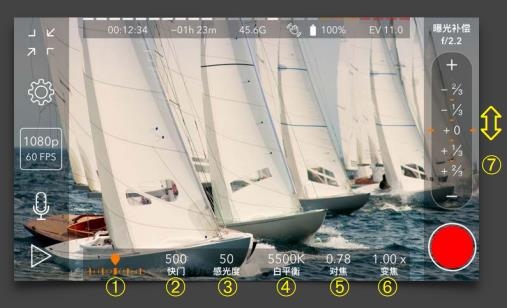 使用①~⑥来查看相机参数,选择需要调整的参数后,通过⑦进行调节。