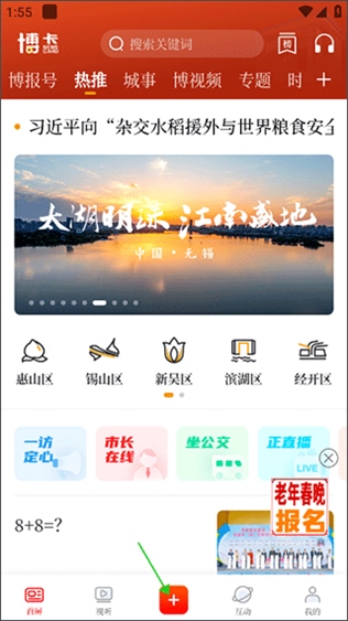 1、打开无锡博报并登录,点击底部中间的红色加号方块。
