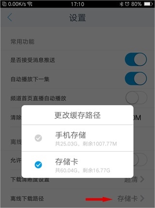 Android:进入客户端 -> 点击左下角“我的” -> 点击右上角“设置” -> 选择“离线下载路径”,可以更改为手机存储或SD卡。以存储卡为例,下载路径为: