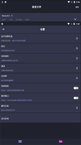 2、点击主页面右上角,可以查看并调整运行权限、格式、采样率、通道、位速率、摇晃录音、悬浮窗口、输出位置及意见反馈等设置。